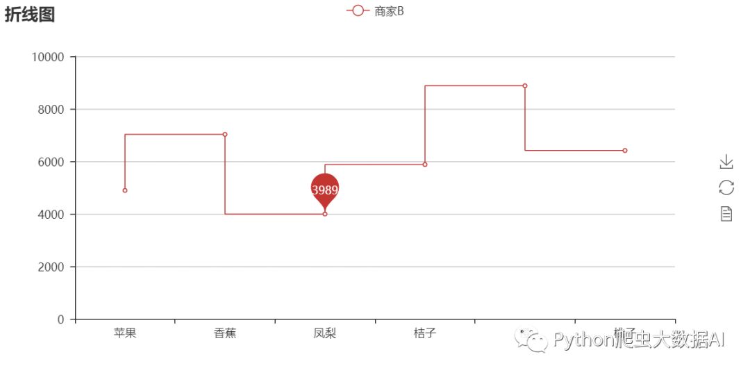 line.add('商家B', fruits, shop2_sales, mark_point=['min'], is_step=True)
