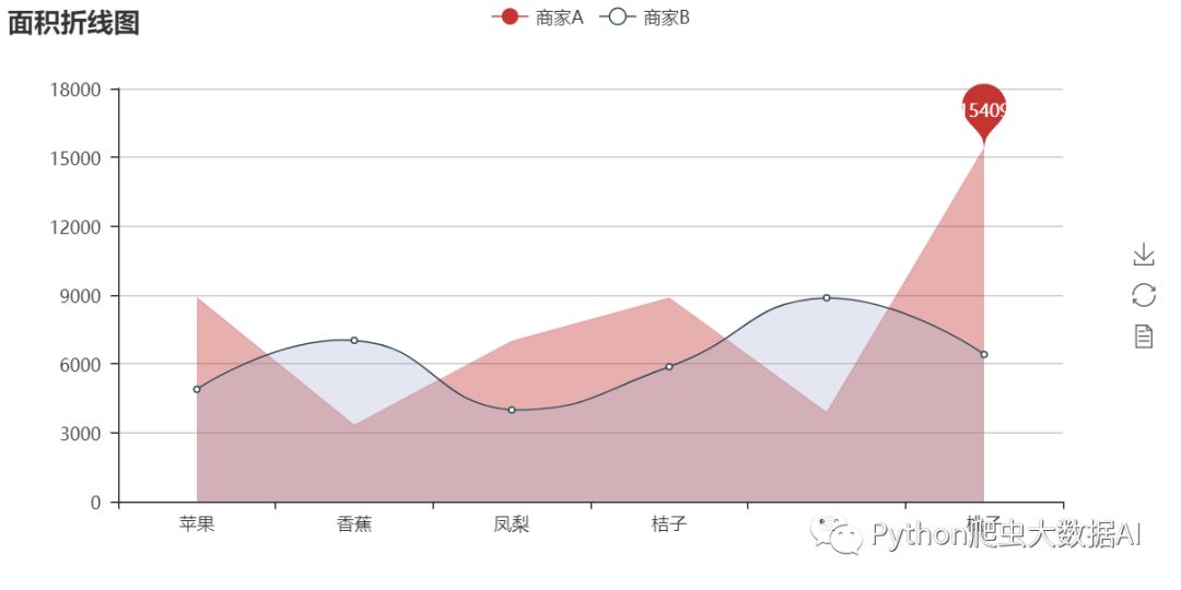 line3.add("商家A", fruits, shop1_sales, is_fill=True, line_opacity=0.2,   area_opacity=0.4, symbol=None, mark_point=['max'])