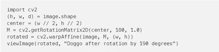 image.shape输出高度、宽度和通道。M是旋转矩阵——它将图像围绕其中心旋转180度。