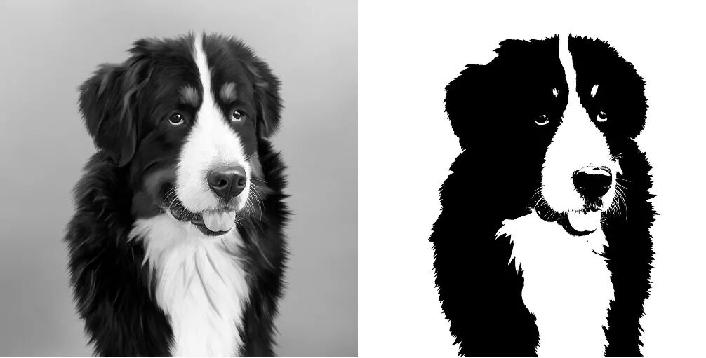 左图:灰阶狗狗。右图:黑白狗狗。