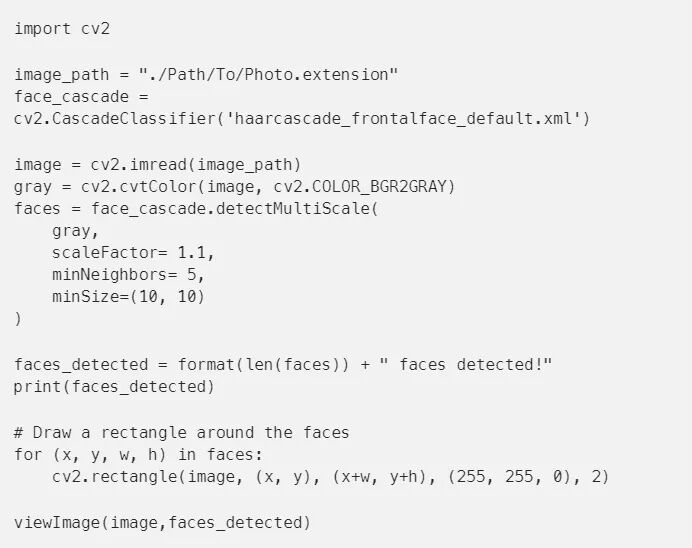 detectMultiScale函数是一种检测对象的通用函数。因为我们调用的是人脸级联,所以它会检测到人脸。