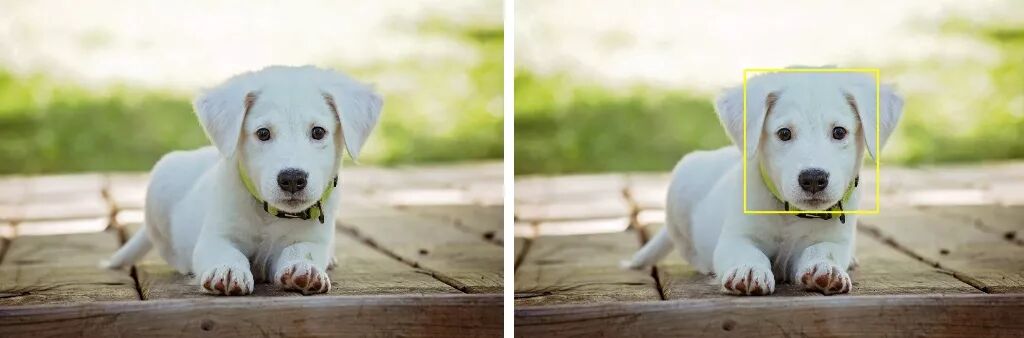 左图:图像来自Pixabay。右图:脸上有一个矩形框的狗狗。
