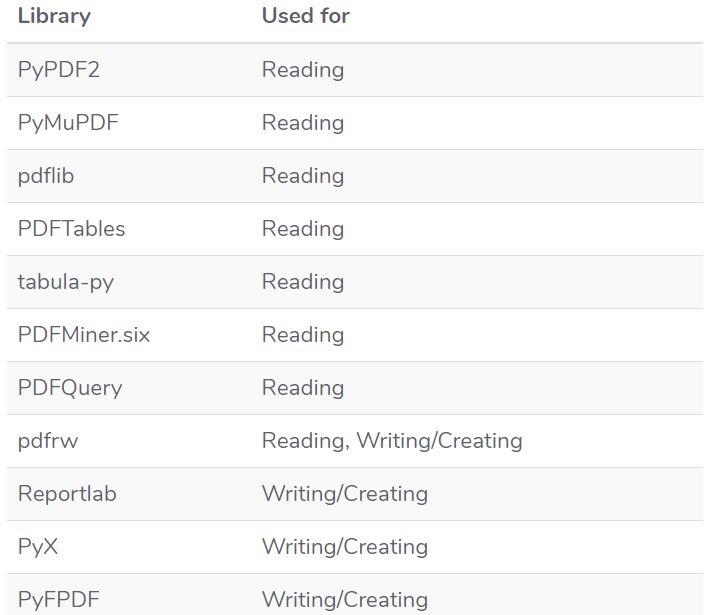 Python相关的PDF工具,模块和库的可用解决方案范围有点令人困惑,需要花一点时间来弄清楚什么是什么,以及哪些项目是持续维护的。 根据我们的研究,这些是目前最新的方案: