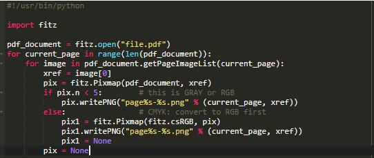 PyMuPDF使用getPageImageList()方法简化了从PDF文档中提取图像的过程。下面的代码来源于PyMuPDF wiki页面的示例,并逐页提取并保存PDF中的所有图像作为PNG文件。 如果图像具有CMYK颜色空间,则首先将其转换为RGB。