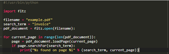 这个功能非常实用,与pdfgrep类似。 使用PyMuPDF,脚本将返回包含给定搜索字符串的所有页码。 页面一个接一个地加载,并且在searchFor()方法的帮助下,检测到搜索字符串的所有出现。 如果匹配,则在stdout上打印相应的消息。