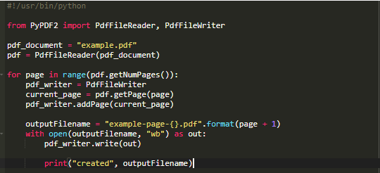 在for循环中,我们创建了一个新的PdfFileWriter实例,它不包含任何页面。 然后,我们使用pdfWriter.addPage()方法将当前页面添加到writer对象。 此方法接受页面对象,我们使用PdfFileReader.getPage()方法获取该页面对象。
