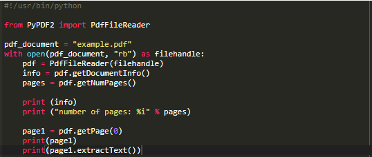 下面的代码首先导入PdfFileReader 类,然后适用这个类打开文件,用getDocumentInfo() 方法来提取文档信息,包括页数和首页内容。