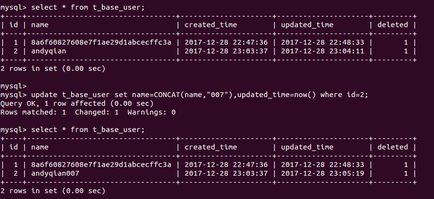 update t_base_user set name=md5(name),updated_time=now() where id=1;