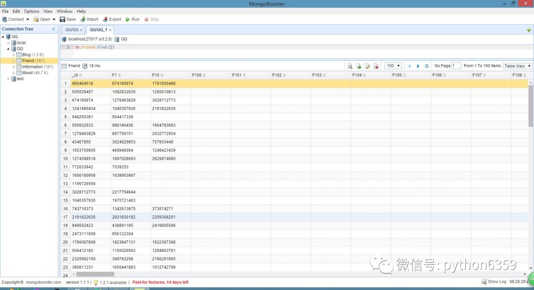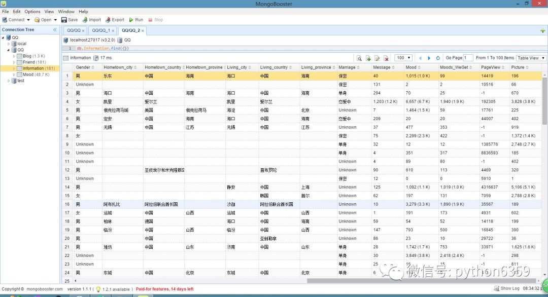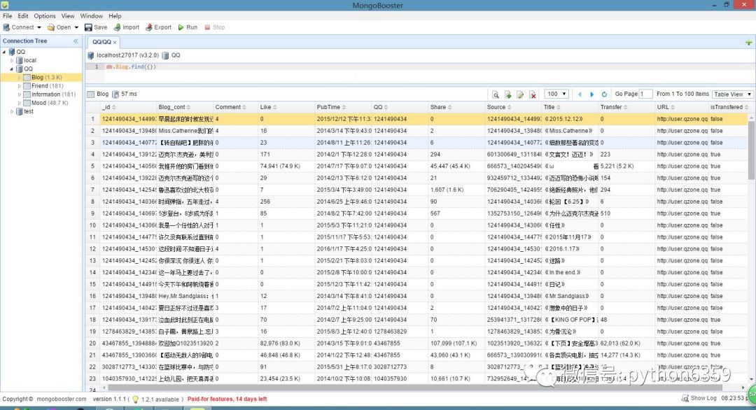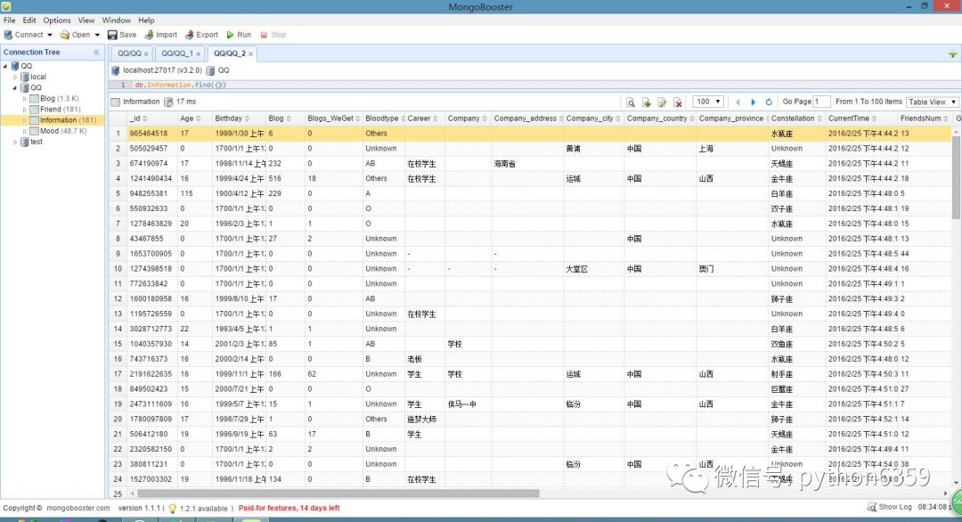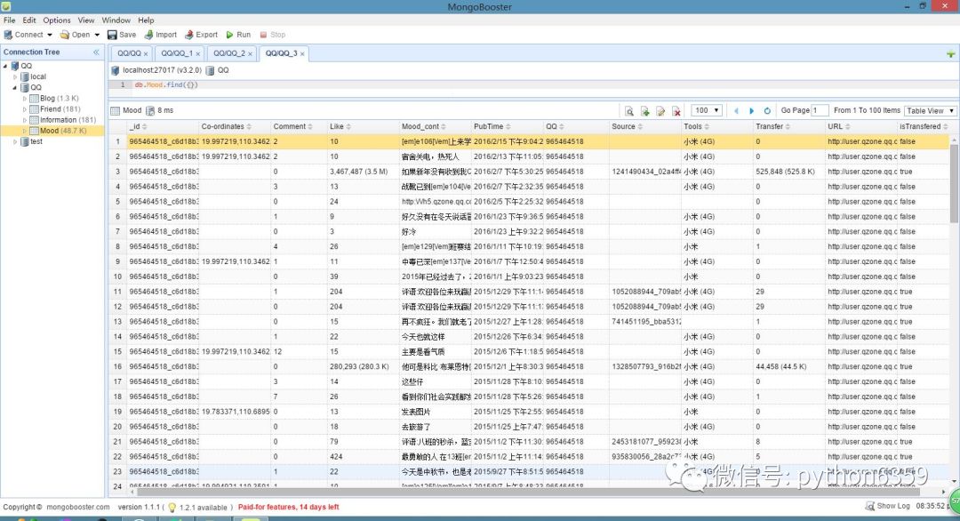 (Python编辑器:Pycharm 5.0.4;MongoDB管理工具:MongoBooster 1.1.1)