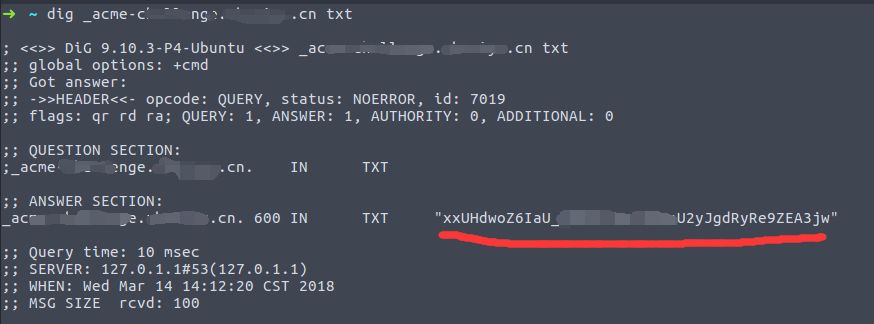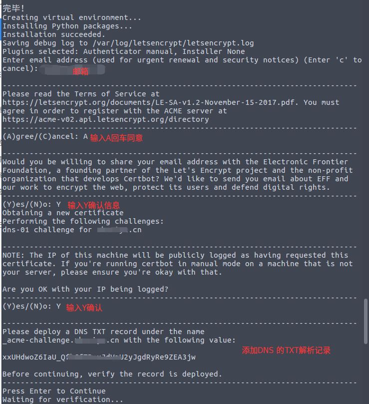 注意,申请通配符证书是要经过DNS认证的,按照提示,前往域名后台添加对应的DNS TXT记录。添加之后,不要心急着按回车,先执行dig xxxx.xxx.com txt确认解析记录是否生效,生效之后再回去按回车确认