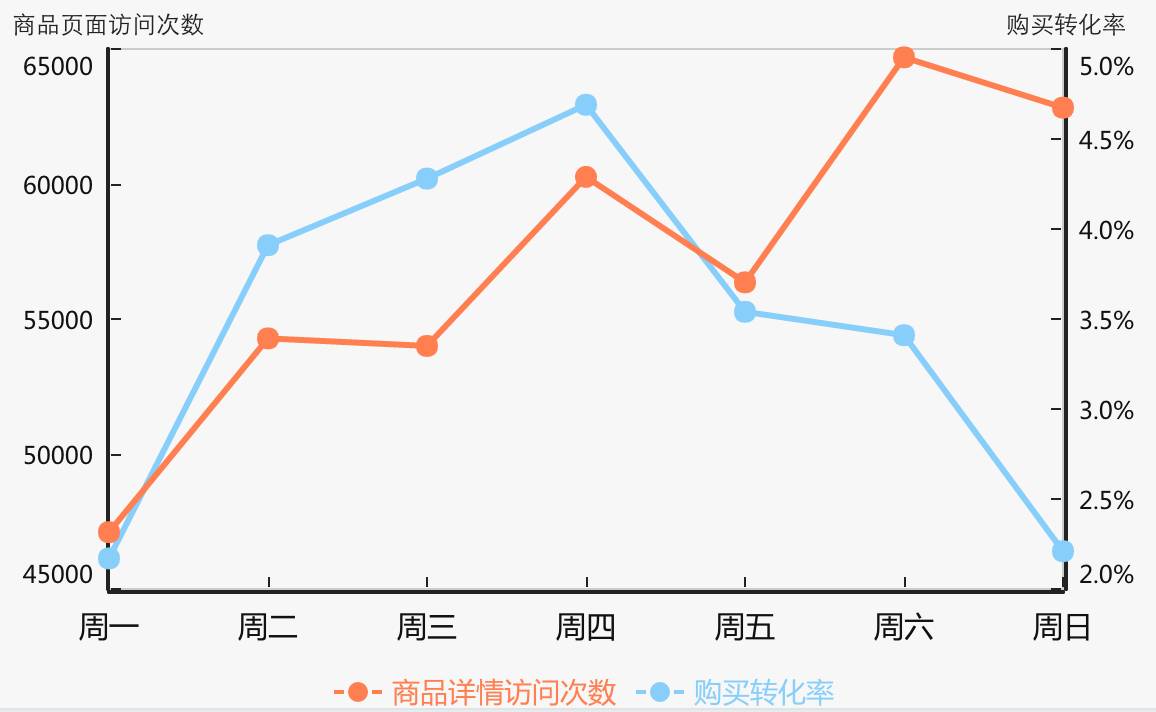 周三、周四的转换率比周末高不少,可能跟平台的发货周期有关,客户周三四下单,希望周末就能收到货,开始快乐的周末。你猜测到用户的心理和期望,连数据一起交市场品团队,期待更好地改善。
